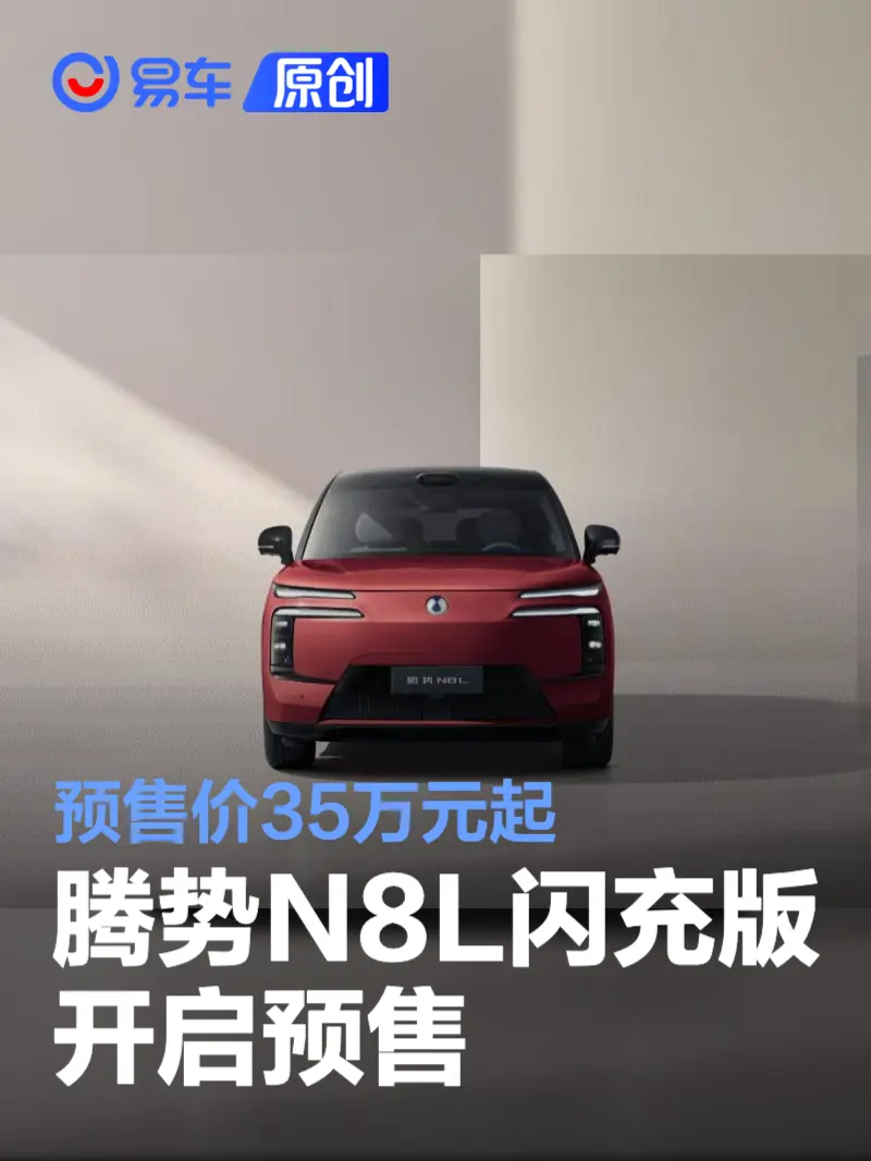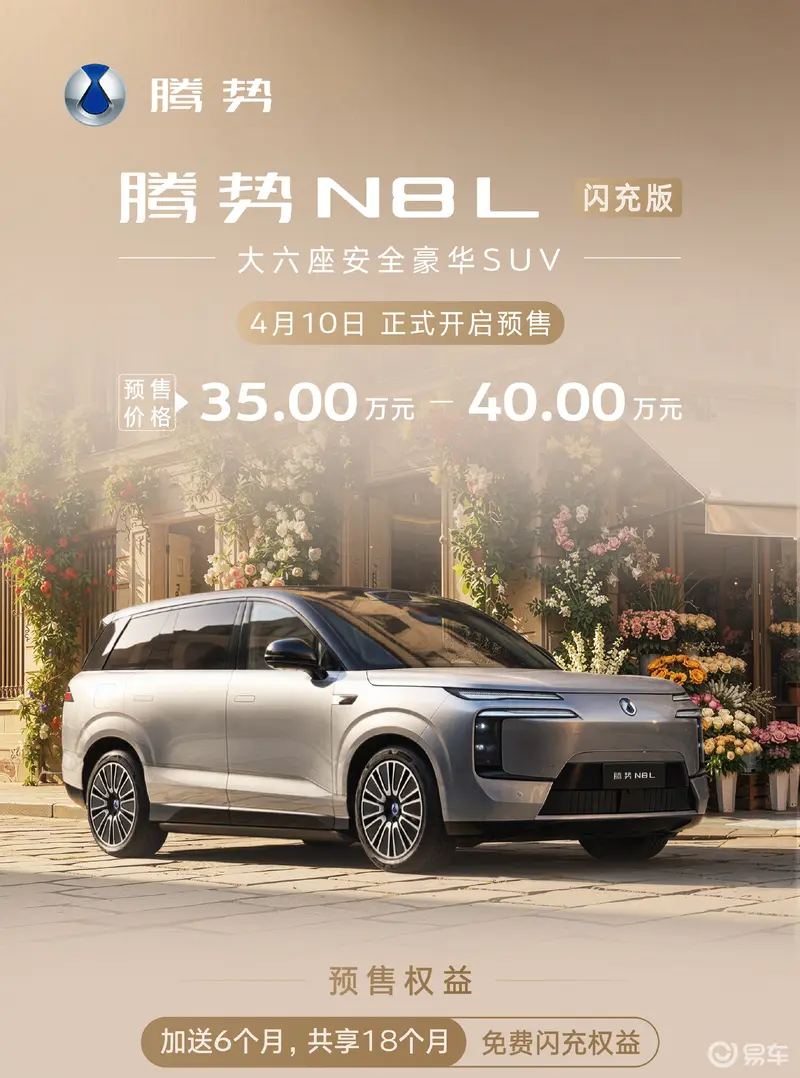 易车讯 4月10日,腾势N8L闪充版正式开启预售,预售价35-40万元。新车搭载天神之眼5.0辅助驾驶系统、新一代AI智能座舱,此外还搭载第二代刀片电池及闪充技术,纯电续航可达430km。