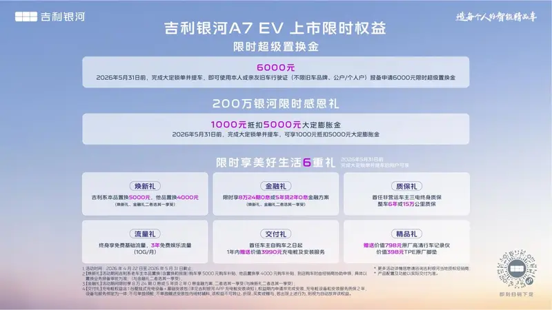 即日起,用户可通过吉利银河APP、微信小程序、抖音小程序及官网等官方渠道下定。凡在2026年5月31日前下定2026款吉利银河A7 EM的用户,可享受5000元超级置换金及1000元抵4000元膨胀金。下定吉利银河A7 EV的用户,可享受6000元超级置换金及1000元抵5000元膨胀金。此外,用户还可限时免享重磅礼、焕新礼、金融礼、质保礼、智行礼、流量礼、交付礼、精品礼在内的多重购车权益,叠加至高 39800 元上市限时权益。