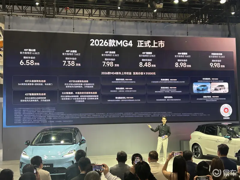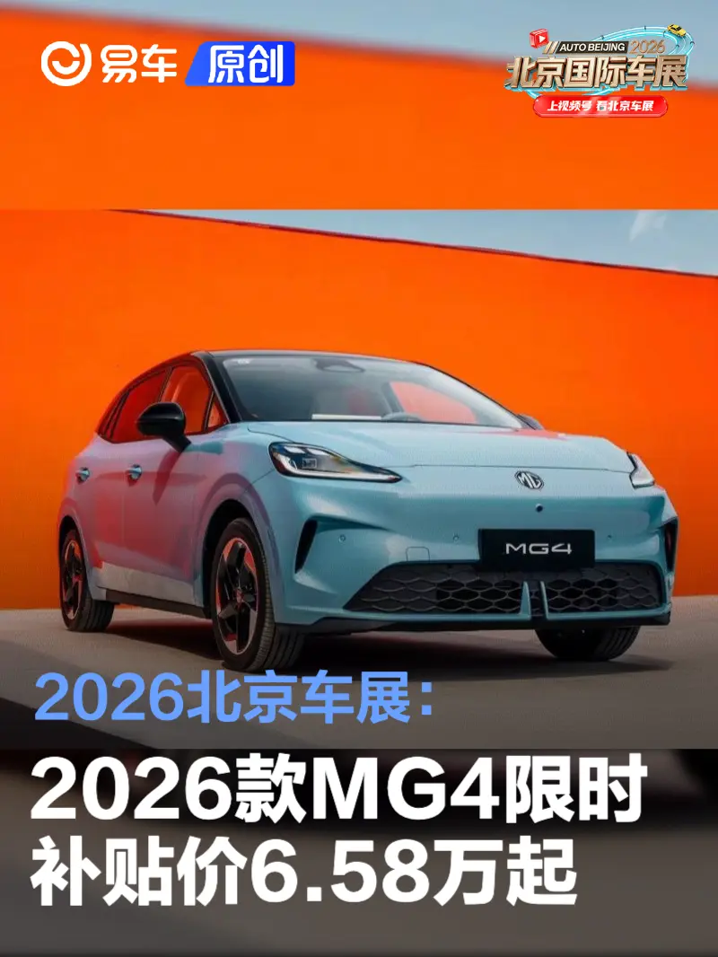 易车讯 在日前开幕的北京车展上,2026款MG4正式上市,官方指导价区间6.88-10.28万元;限时补贴价区间6.58-9.98万元。