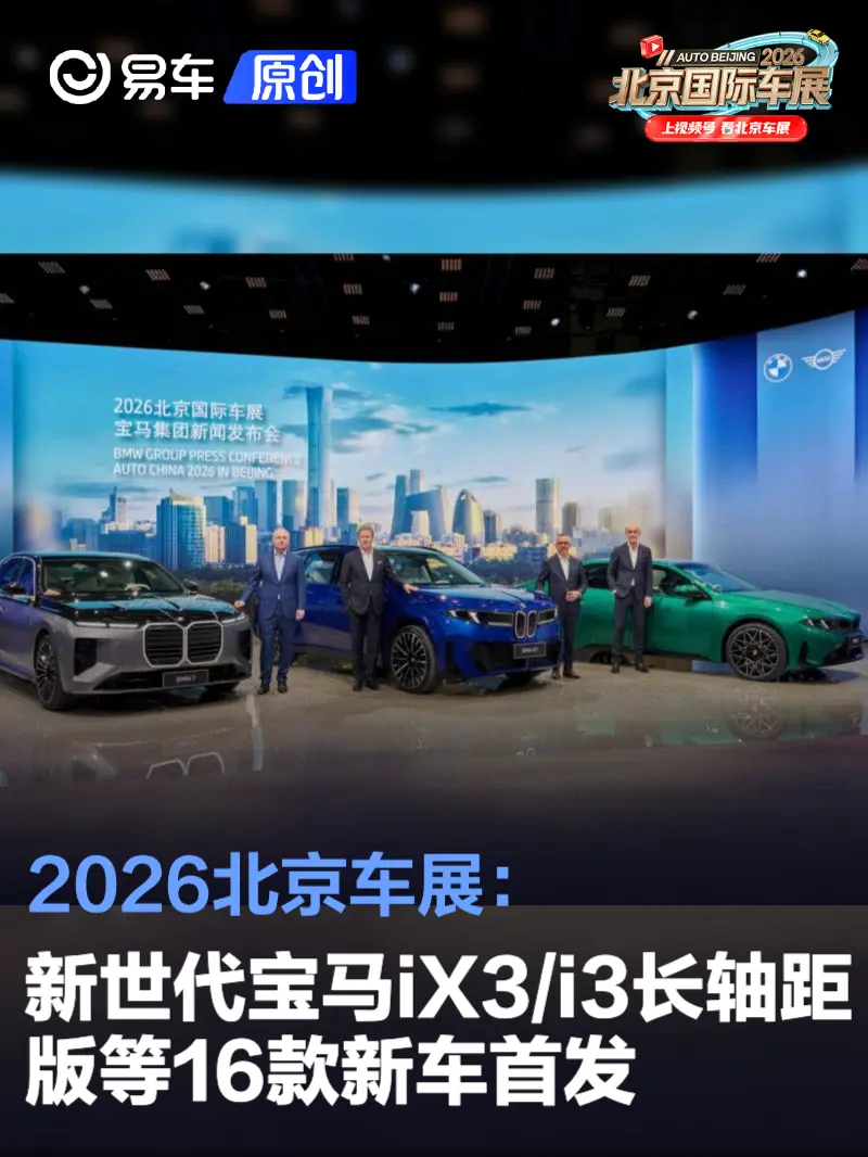 易车讯 在4月24日开幕的北京车展上,宝马集团携16款首发车型正式亮相,覆盖旗下BMW、MINI与BMW Motorrad三大品牌。全新BMW 7系、新世代BMW iX3长轴距版、新世代BMW i3长轴距版三款新车首发。BMW Speedtop概念车首次登陆中国,为纪念BMW M3诞生40周年推出的BMW M3 40周年限量版,MINI X VAGABUND创意展车也亮相展台。据悉,2026年宝马集团旗下BMW、MINI及BMW Motorrad三大品牌将推出约20款全新或改款车型。