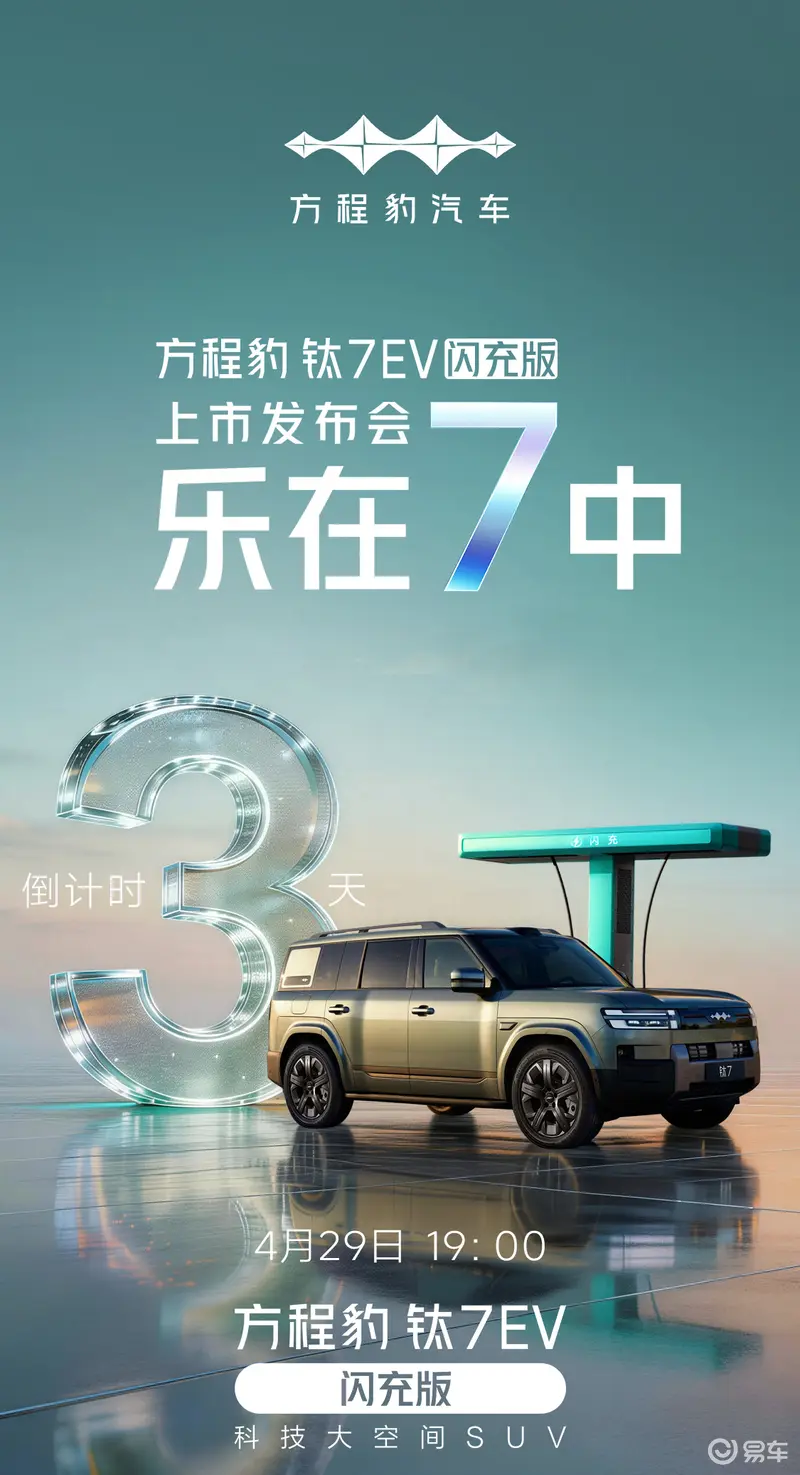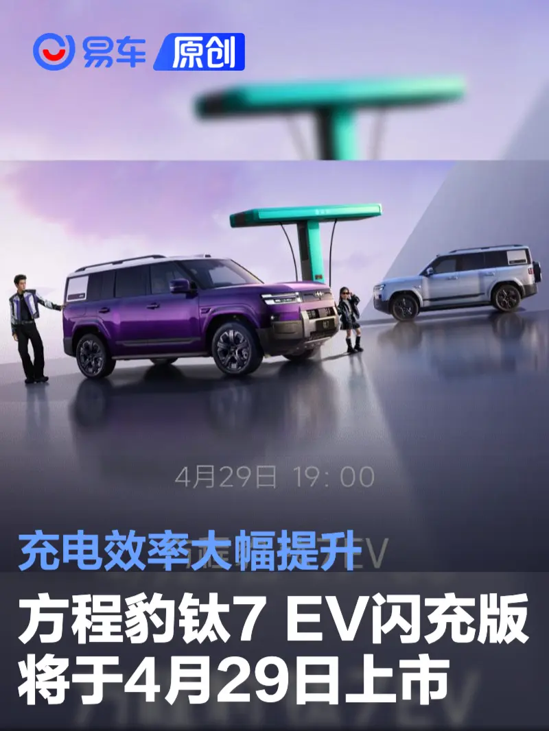 易车讯 我们从比亚迪官方获悉,方程豹钛7 EV闪充版将于4月29日正式上市。新车整体设计基本与插混版保持一致,最大的亮点是搭载第二代刀片电池以及闪充技术。
