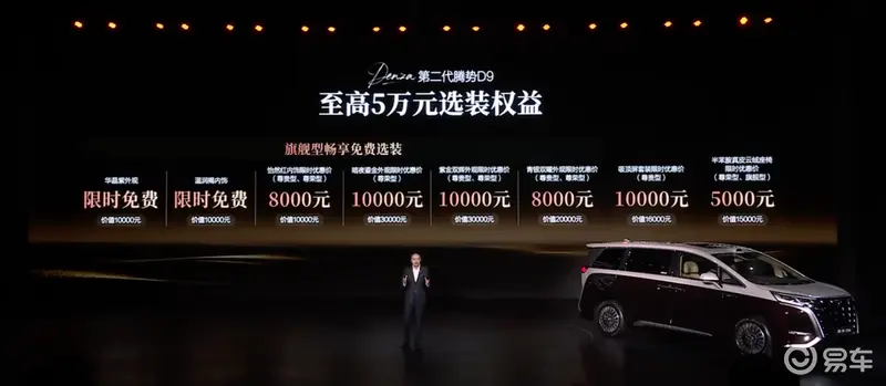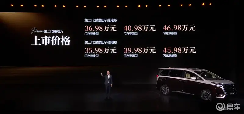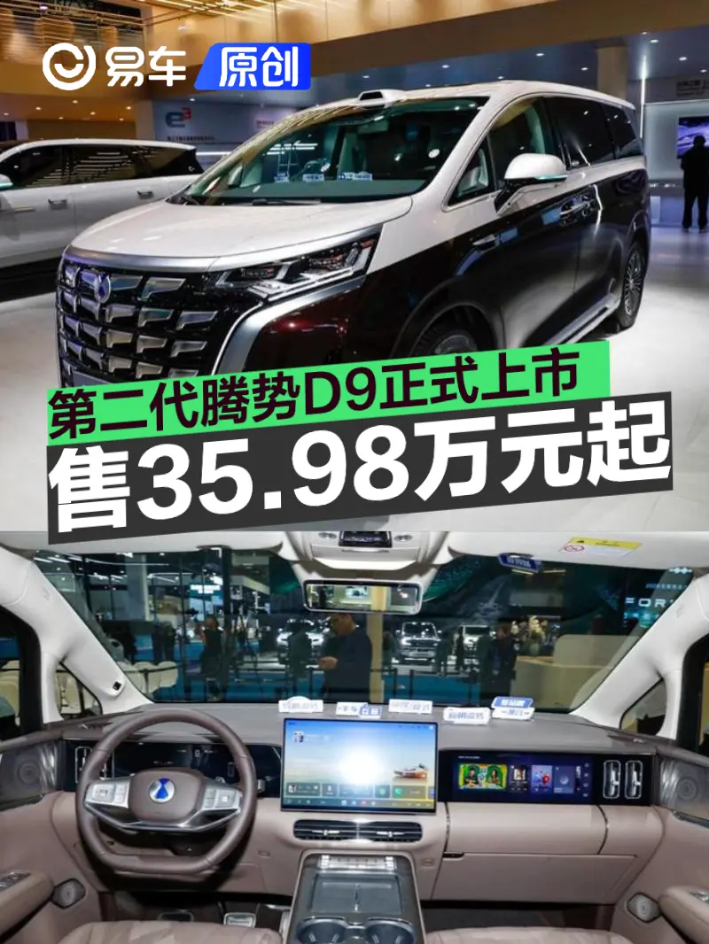 易车讯 4月27日,腾势官方宣布第二代腾势D9迎来正式上市,新车共推出6款车型,售价区间35.98-45.98万元。作为换代车型,新车对外观进行了多处全新设计,动力方面搭载第二代刀片电池,并配备闪充技术。官方表示,新车预计5月中旬开启交付。