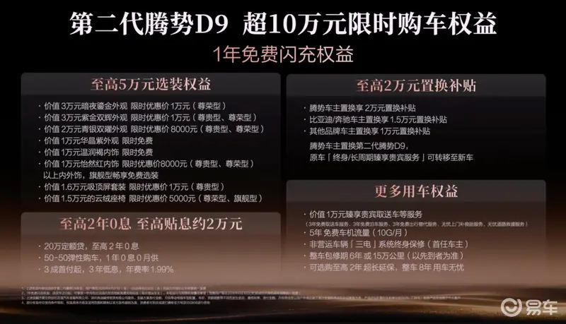 新车推出至高5万元选装权益,同时还拥有1年免费闪充权益,至高2万元置换补贴等限时购车权益。