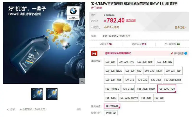以上一代宝马3系中搭载N20发动机的320Li为例,通过天猫旗舰店购买原价978元的机油保养套餐,可以享受20%优惠,这与宝马官方为3-7年车龄3系提供的“长悦保养计划”价格相同,而超过7年车龄的3系可以享受更高的30%折扣。