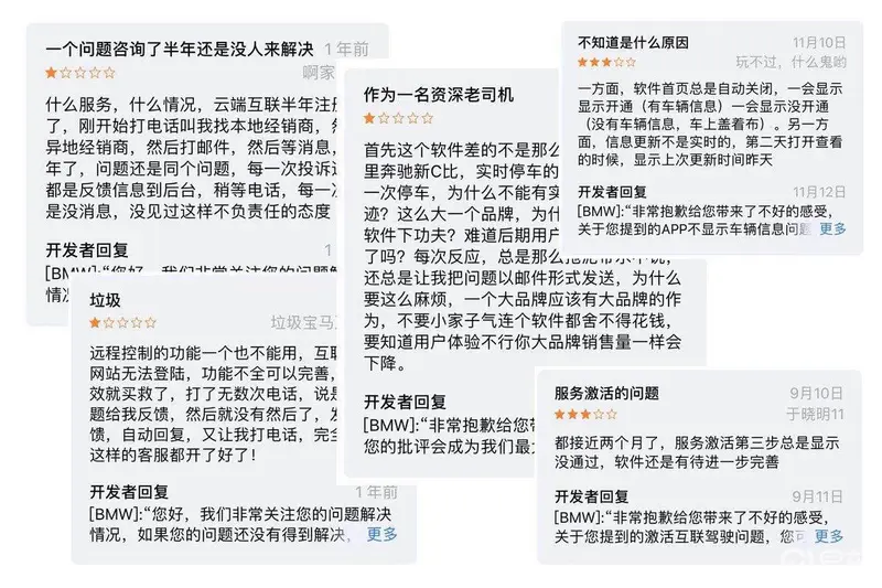 再看看App Store上宝马一款App下的用户评价,依然有很多吐槽的声音:比如无法注册又无人解决、远程启动功能无法使用、数据更新不及时等……