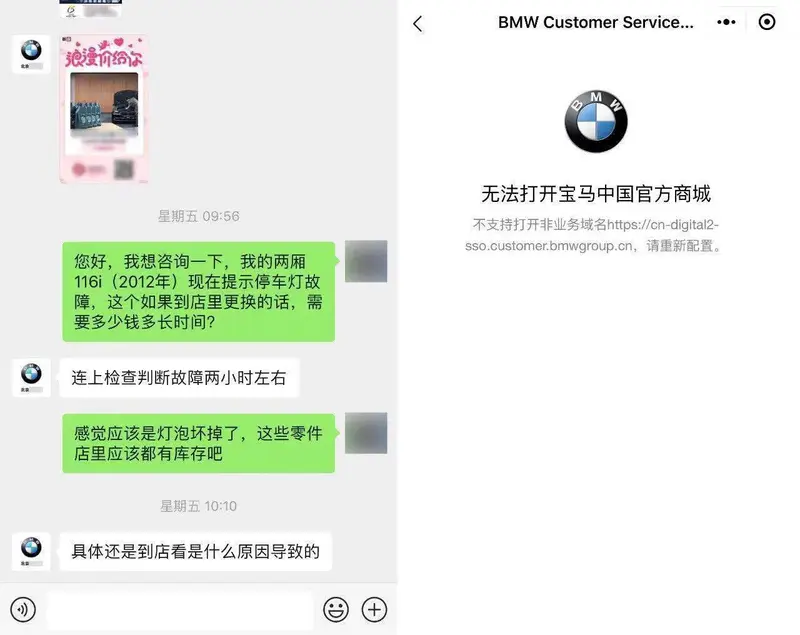 想来可能有点难为客服专员,于是我又在微信里试图搜索宝马的官方客服,但结果却是“页面无法打开”。