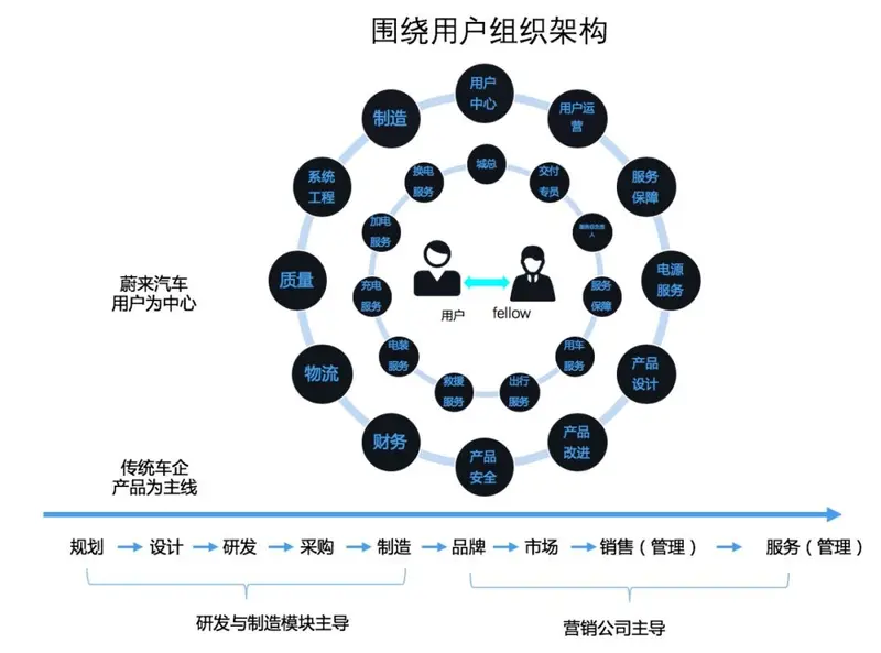 此前,车联天下董事长杨泓泽为汽车产经绘制了一张架构图,以展示互联网车企蔚来与传统车企组织架构的区别:与传统车企以产品为主线不同,蔚来围绕用户建立了组织架构,所有环节都以用户为核心。