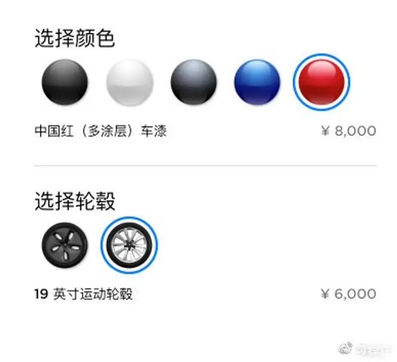 从公告来看,这次的选配价格调整包括车漆颜色与轮毂两个方面。