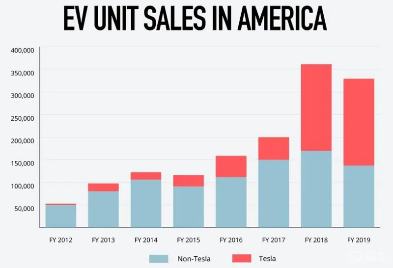 3 Model Y的销量超过其他车型总和 1月7号的时候,你专程乘坐私人飞机到上海,参加上海超级工厂向普通车主交付的仪式。在现场采访时,你说Model Y的需求最终会超过其他特斯拉车型的总和。 这真是引起了中国新能源车企极大的恐慌。Model Y问世前,特斯拉的销量在美国就已经占整个电动车市场的58%。再有Model Y助攻,那还得了!中国的电动车市场可能比美国要更百花齐放,但被你这条“大鱼”抢走份额,这是不用质疑的了。 我替你算了一下,特斯拉2019年的总销量是36.75万辆,如果新的一年Model Y最终超过其他特斯拉车型的总和,那么正如你在2019年Q4的财报发布会上所说,2020年,特斯拉的交付量将会轻松超越50万辆。 你也别高兴得太早,麻烦事还有很多。 譬如,现在在中国生产的Model 3价格已下探到30万元以下,下一年肯定会带来更好看的成绩。规模变大,价格走低,这对潜在消费者来说是好事。但对旧车主来说就是另一回事了。你听,“老韭菜们”已经在磨刀霍霍,准备把你唱衰。美国市场特斯拉与非特斯拉电动车份额对比