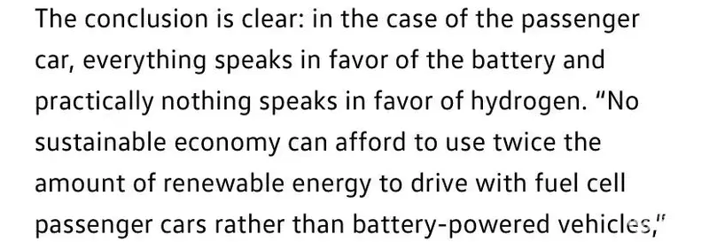 大众引用了管理咨询公司Horvath&Partners的独立研究成果:电池电动车的效率在70%到80%,这意味着电网产生的电能有3/4能用于动力推进。相比之下,燃料电池车的效率则要低得多得多,其只有大约25%到35%的能量能真正用于驱动汽车(目前制氢最常用的方法电解法,需要消耗大量能量)。也就是说,氢燃料电池车跑一段路程所消耗的能量,用在电池电动车上能跑到2至3倍的距离。能效这么低,为什么还要出力不讨好的发展氢燃料电池技术?