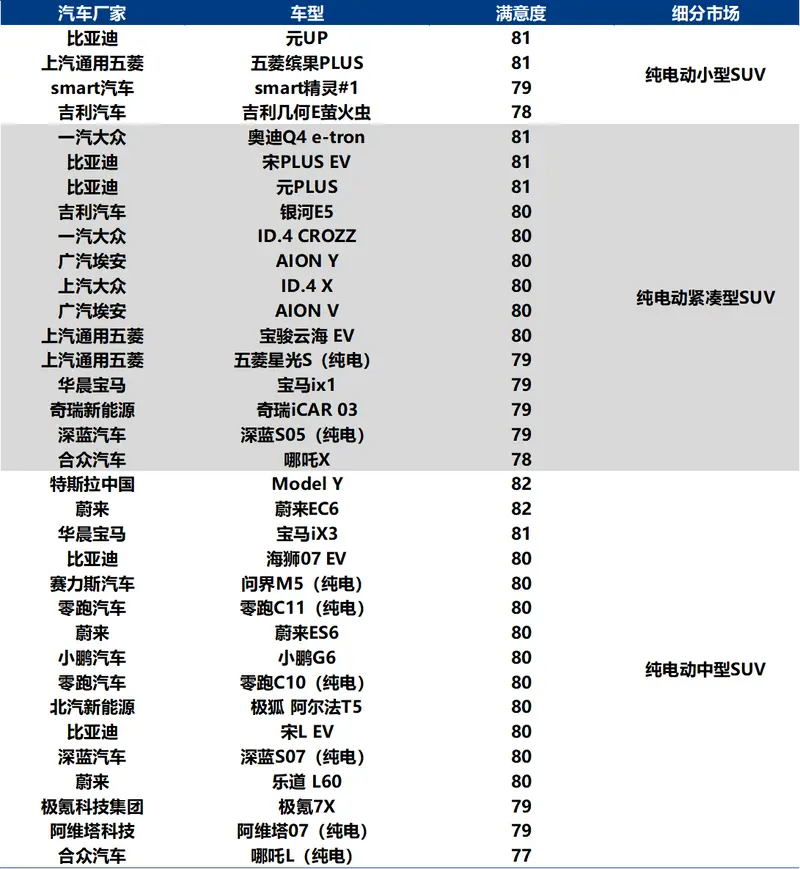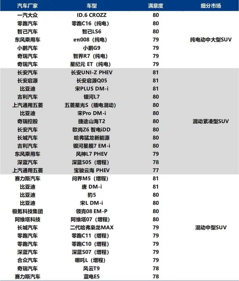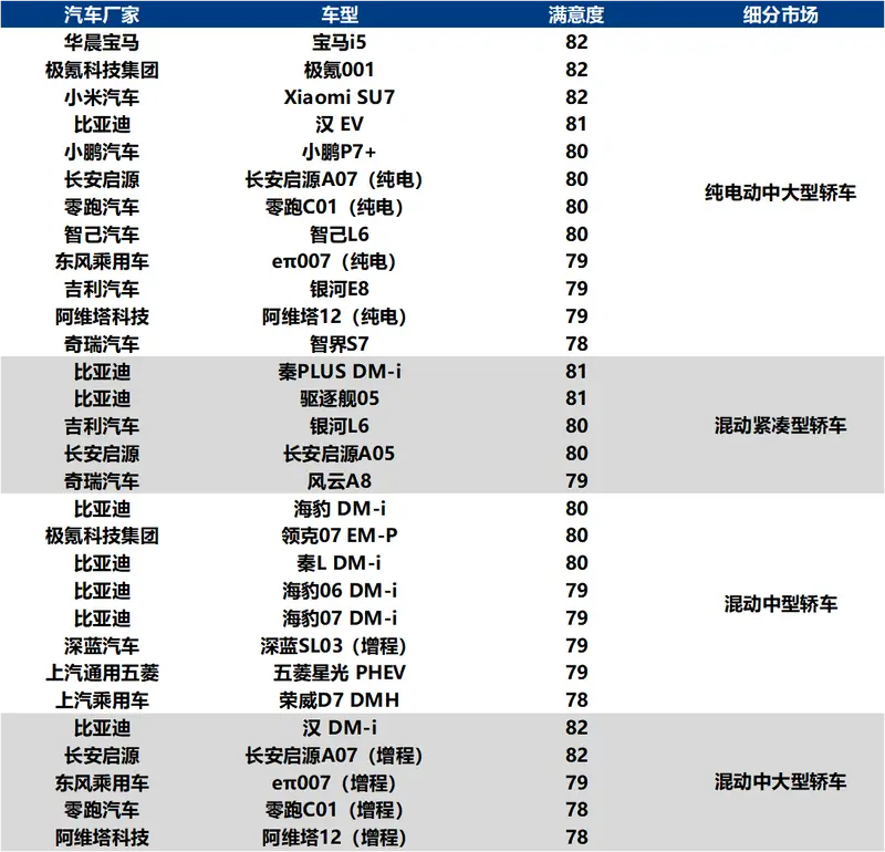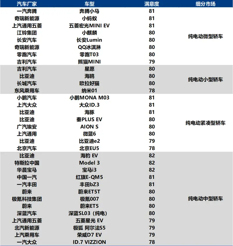 以新能源类别及车型结构类别综合划分细分市场车型,各细分市场NEV-CACSI(新能源汽车综合满意度指数)第一(含并列第一)的车型是: