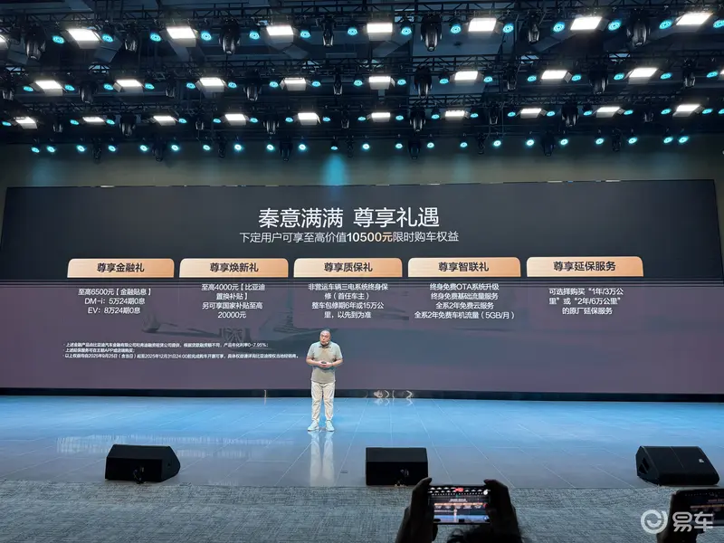 新车上市的同时比亚迪还推出丰厚的购车礼遇,下定用户可享至高价值10500元限时购车权益,包含至高6500元金融贴息、至高4000元比亚迪置换补贴(另可享国家补贴至高20000元)、非营运车辆三电系统终身保修(首任车主)整车包修期6年或15万公里(以先到为准)、终身免费OTA系统升级、终身免费基础流量服务、全系2年免费云服务、全系2年免费车机流量(5GB/月),可选择购买“1年/3万公里”或“2年/6万公里“的原厂延保服务。