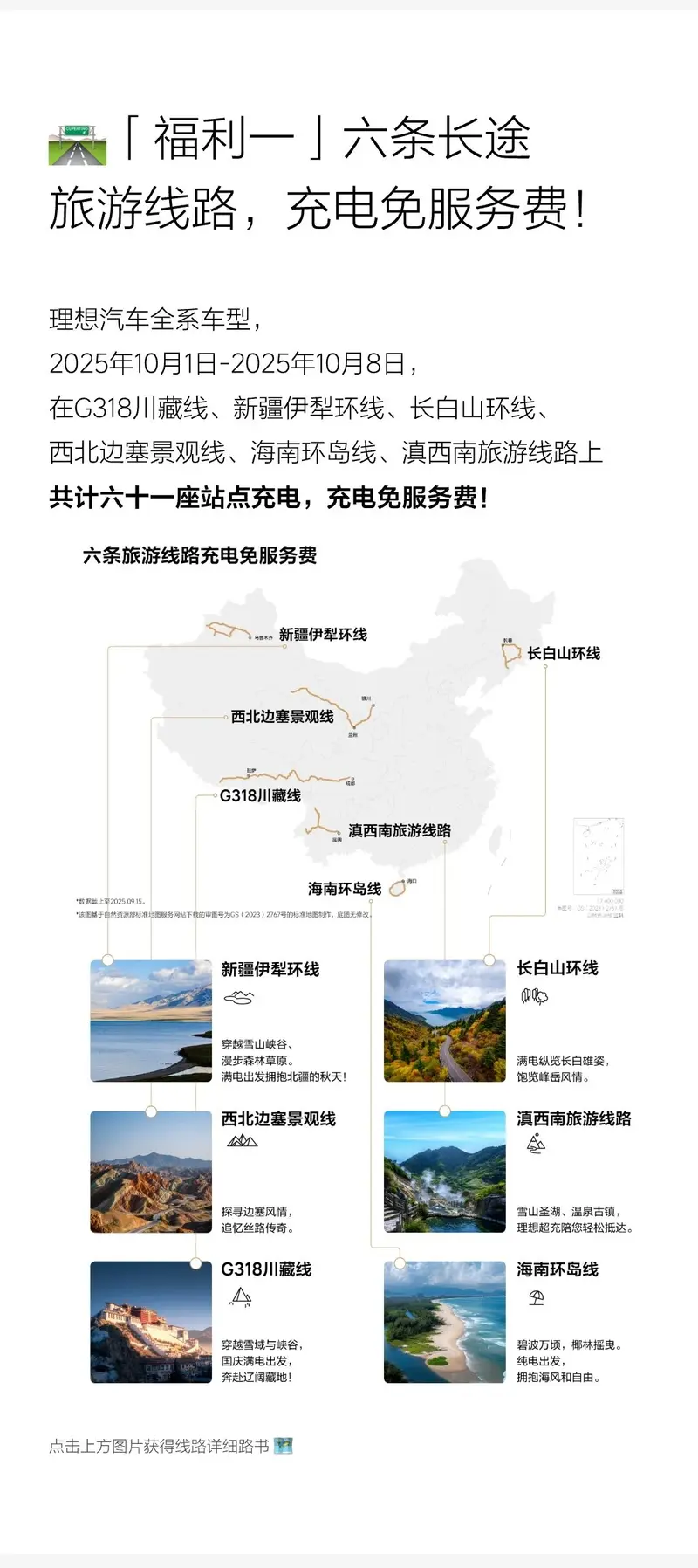 易车讯 日前,理想汽车官方发布,庆祝理想i6发布上市,喜迎国庆中秋团圆假期,理想车主专享三重超充权益即将上线。福利包含六条长途旅游线路,充电免服务费;理想车主充电服务费折扣券大放送;高速充电专属保障计划。