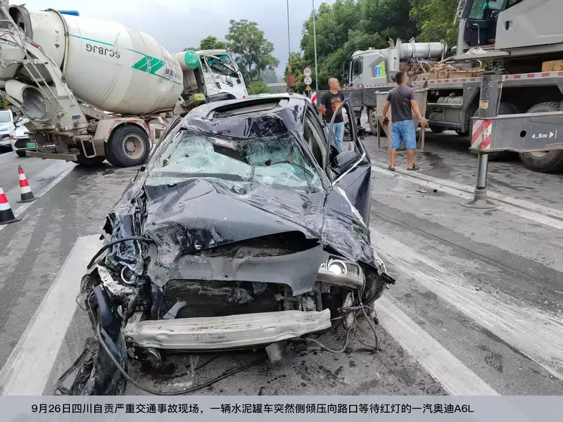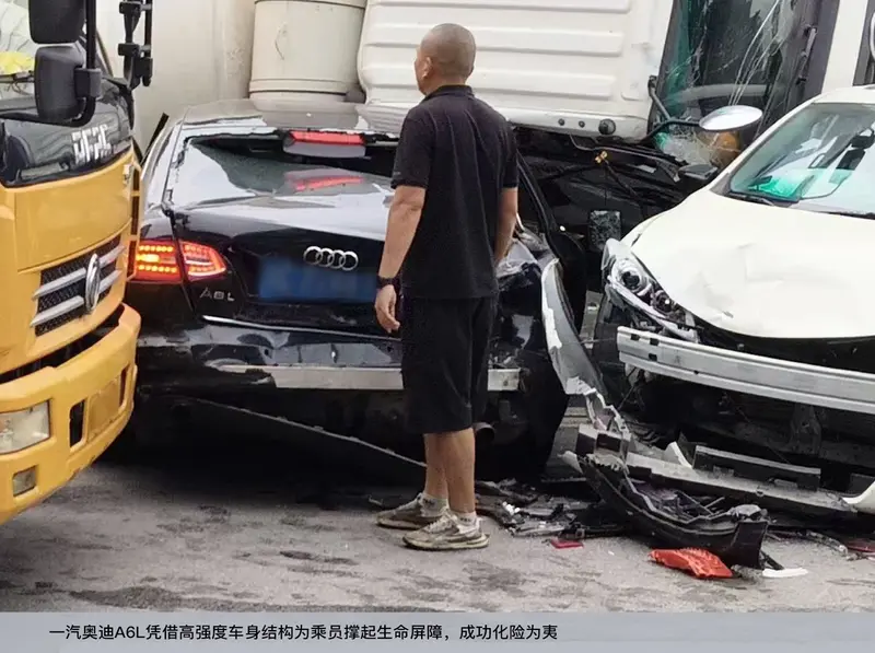 9月26日,车主詹先生所经营公司的驾驶员潘先生因业务需要,驾驶一汽奥迪A6L载同事沿G348国道前行。当车辆行驶至沿滩交叉路口并按交通规则停在红灯线前等待时,对向车道一辆水泥罐车突然发生侧翻,巨大的罐体直接砸向潘先生驾驶车辆的车头及A柱位置。所幸,得益于一汽奥迪A6L高强度车身结构与先进安全设计,车身在瞬间形成了坚固防护,牢牢支撑起座舱的生存空间。面对如此剧烈的冲击,驾驶席的潘先生仅受轻微擦伤,后排同事更是毫发无损,成功化险为夷。事后,潘先生在接受采访时多次动情表示:“感谢奥迪救了我的命。”