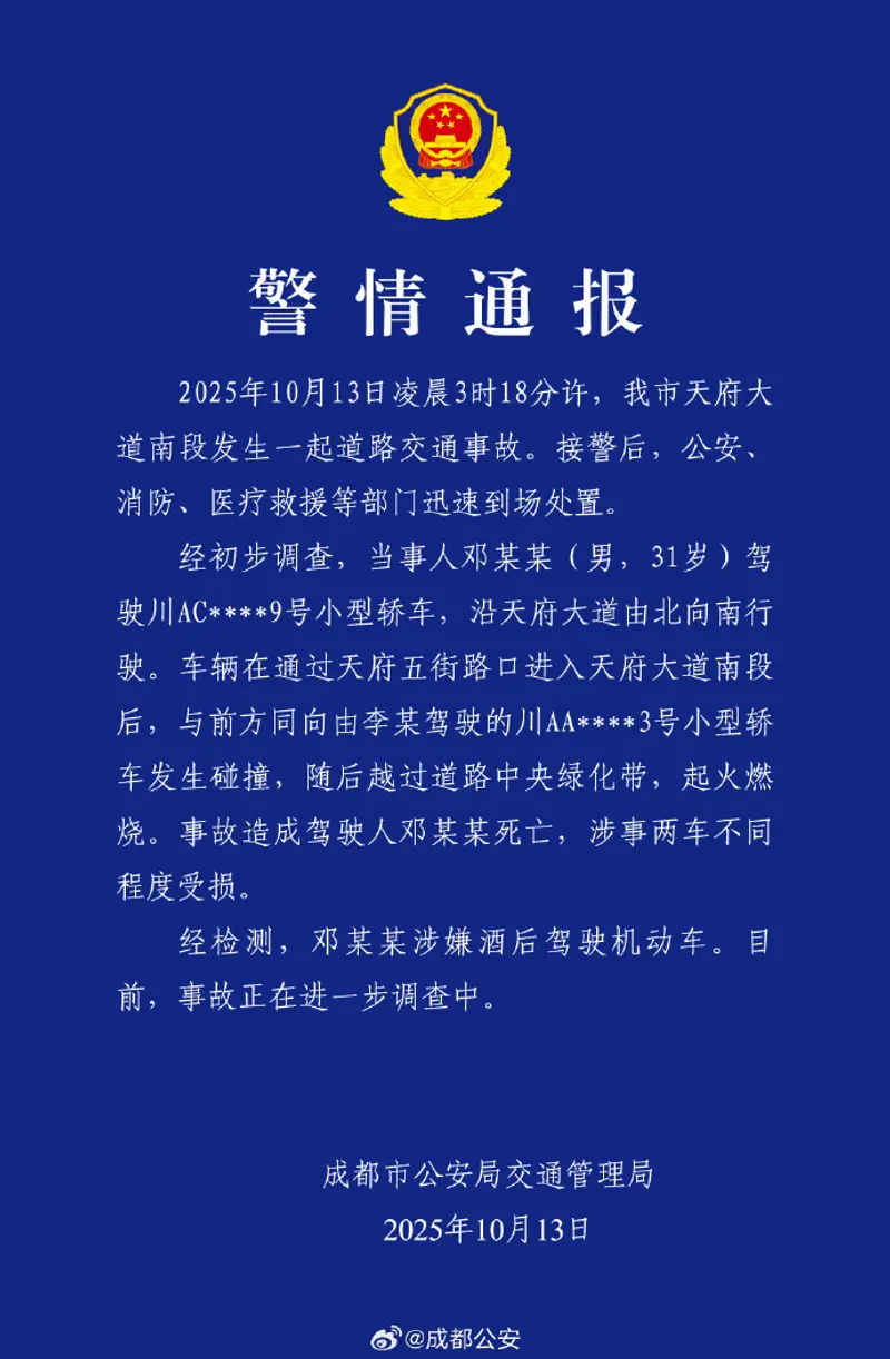 易车讯 成都市公安局交通管理局10月13日通报,2025年10月13日凌晨3时18分许,我市天府大道南段发生一起道路交通事故。接警后,公安消防、医疗救援等部门迅速到场处置。