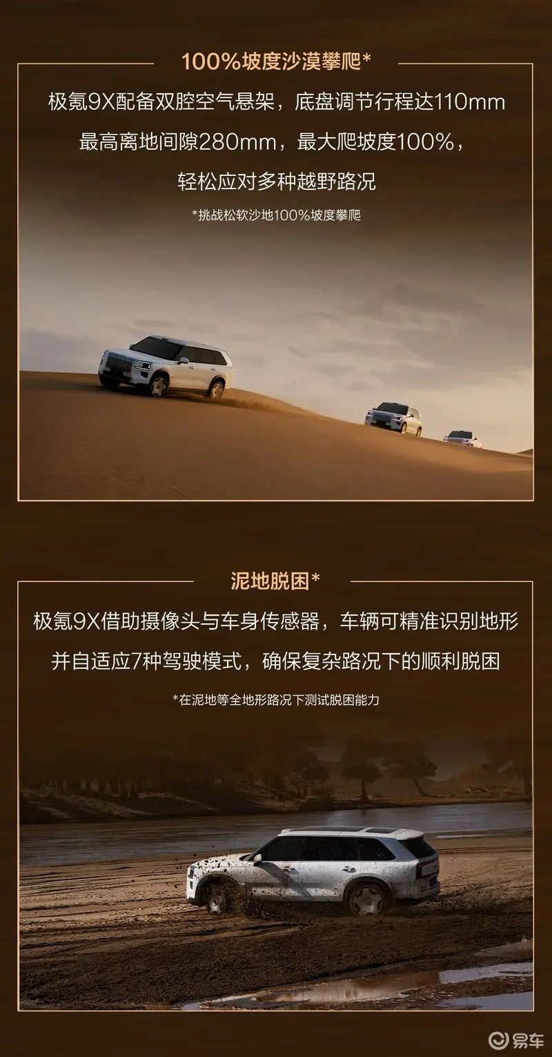 戈壁碎石路高速通行,极氪9X采用双阀CCD电磁减振器,有效吸收高频振动,降低车内颠簸,全场景保障舒适性。沙尘暴横风稳定,极氪9X通过”定海智能中枢“,整合悬架、制动、转向与动力系统,结合辅助驾驶算力,在沙尘暴中稳定操控,安全通过。100%坡度沙漠攀爬,极氪9X配备双腔空气悬架,底盘调节行程达110mm最高离地间隙280mm,最大爬坡度100%,轻松应对多种越野路况。泥地脱困,极氪9X借助摄像头与车身传感器,车辆可精准识别地形并自适应7种驾驶模式,确保复杂路况下的顺利脱困。