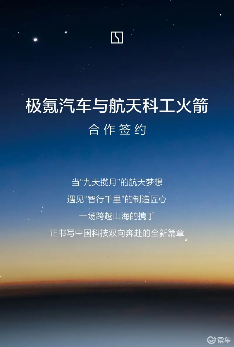 易车讯 10月21日,极氪汽车官方宣布,极氪汽车与航天科工火箭合作签约,护航航天重大任务。10月20日,极氪汽车X航天科工火箭正式签署合作协议,极氪9X成为航天重大任务保障用车。