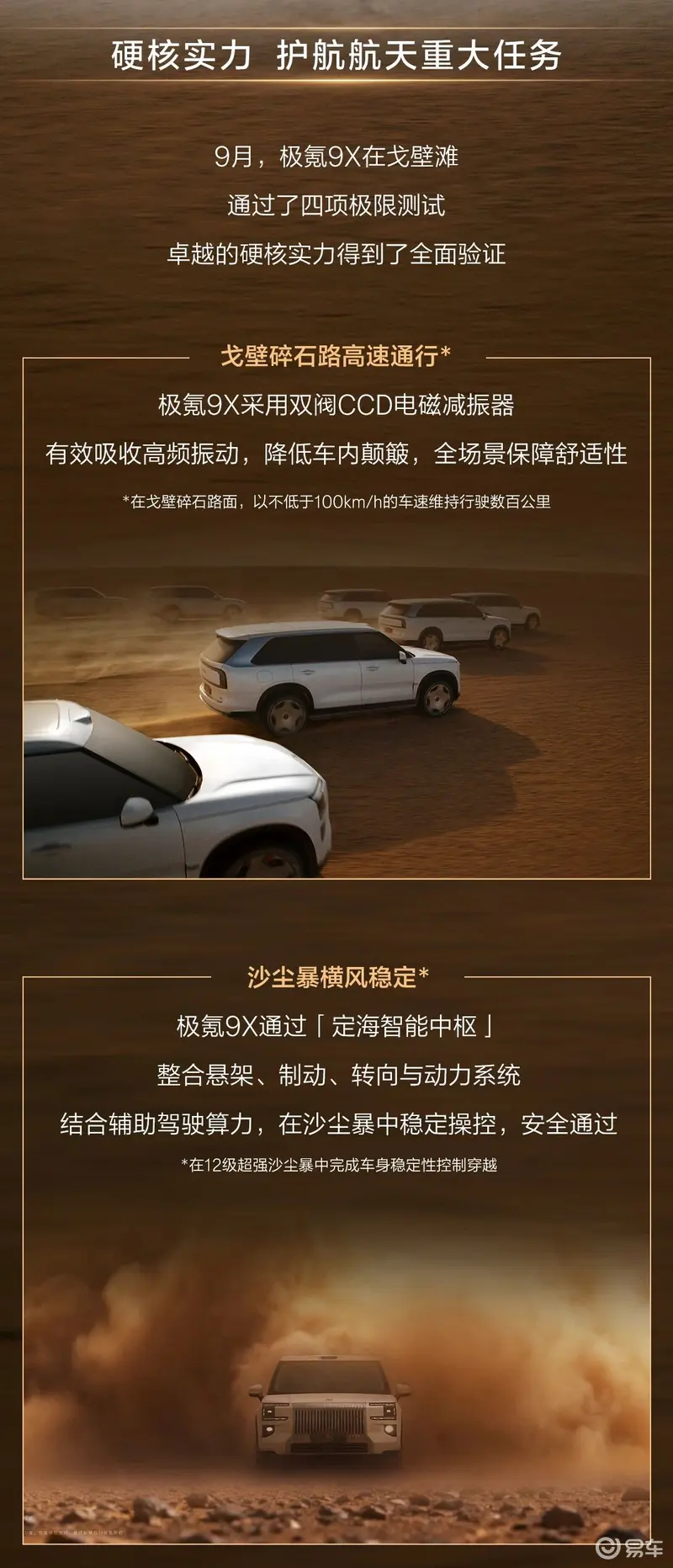 9月,极氪9X在戈壁滩通过了四项极限测试。在戈壁碎石路面,以不低于100km/h的车速维持行驶数百公里、在12级超强沙尘暴中完成车身稳定性控制穿越、挑战松软沙地100%坡度攀爬、在泥地等全地形路况下测试脱困能力。