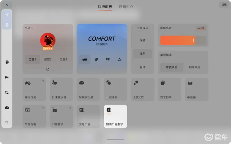 若无法正常通过中控屏解锁加油口盖,可向下长按中控台上「危险警告灯开关」5s,应急解锁。若在30 min 内未完成燃油加注,防油箱隔离阀将自动关闭,需再次解锁打开。