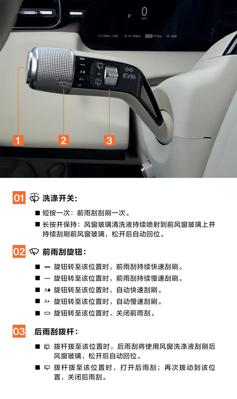 由于极氪9X采用怀档设计,换挡拨杆位于方向盘右后侧。因此,雨刮操作开关和远近光切换均位于方向盘左后侧,并可控制前/后雨刮器和洗涤器。