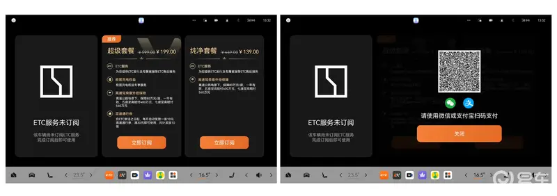 第一步:订阅进入车机应用市场,下载安装「ETC」应用,安装完成后,进入应用,选择套餐进行订阅,使用微信或支付宝进行扫码支付,成功订阅ETC。