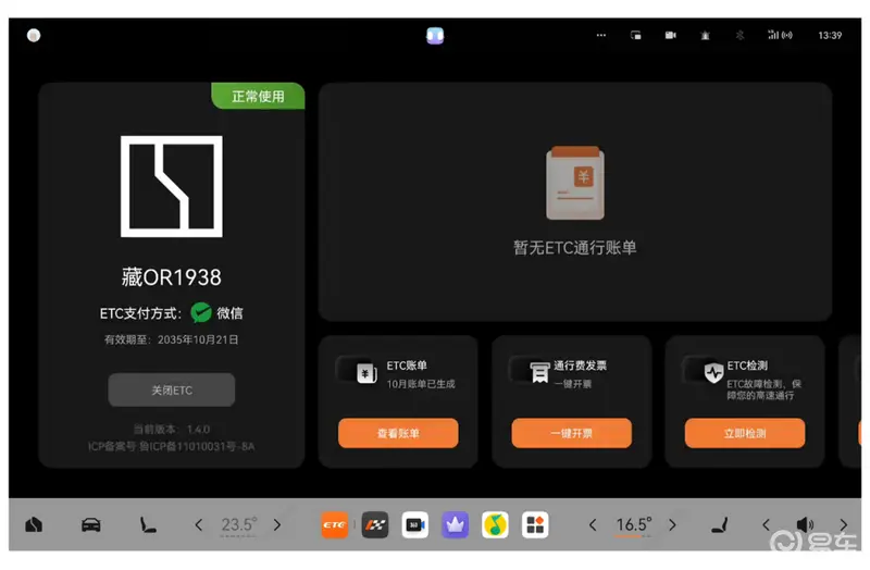 ③开具发票—可查看ETC通行账单内容进入车机「ETC服务」APP,点击「发票开具」。选择需要开票的通行记录(系统自动关联当前车机 VIN 码对应的 ETC 卡消费记录)。确认发票信息(抬头、金额等),提交后可生成电子发票,支持下载或发送至邮箱。
