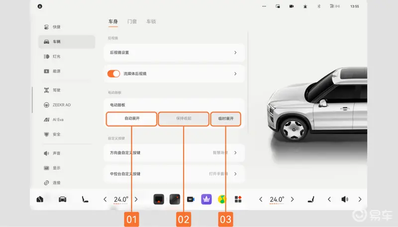 电动踏板可在中控屏选择「车辆」-「车身」,进行模式设置: