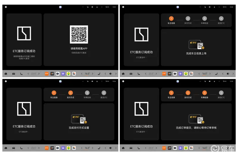 第二步:提交审核完成订阅后,使用极氪App扫码,填写ETC办理人信息、行驶证信息,通行费代扣签约(支持微信、支付宝、银行卡扣款), 完成后提交资料进行审核。审核过程中,车机将清晰展示当前审核节点状态。