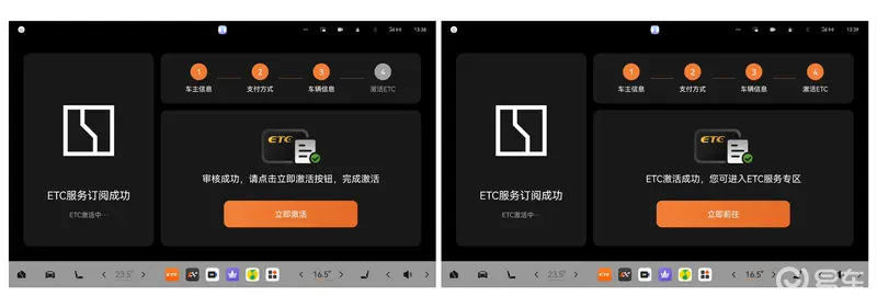 第三步:完成激活资料审核通过后,点击「立即激活」按钮, 车机端出现「ETC激活成功」展示,即完成设备激活,可点击立即前往进行ETC相关功能使用。