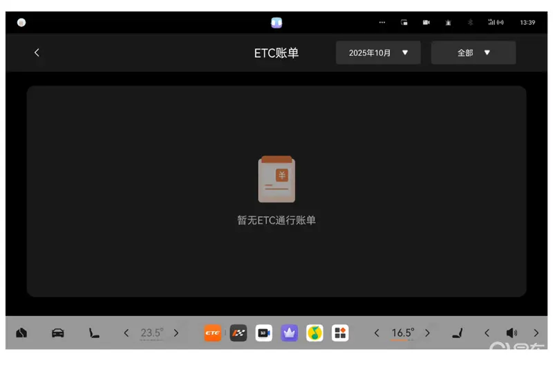 ②查看账单—可查看ETC通行账单内容进入车机「ETC服务」APP,点击「ETC账单」。系统将展示高速通行账单,包括通行时间、金额、出入口等信息。支持按时间筛选。