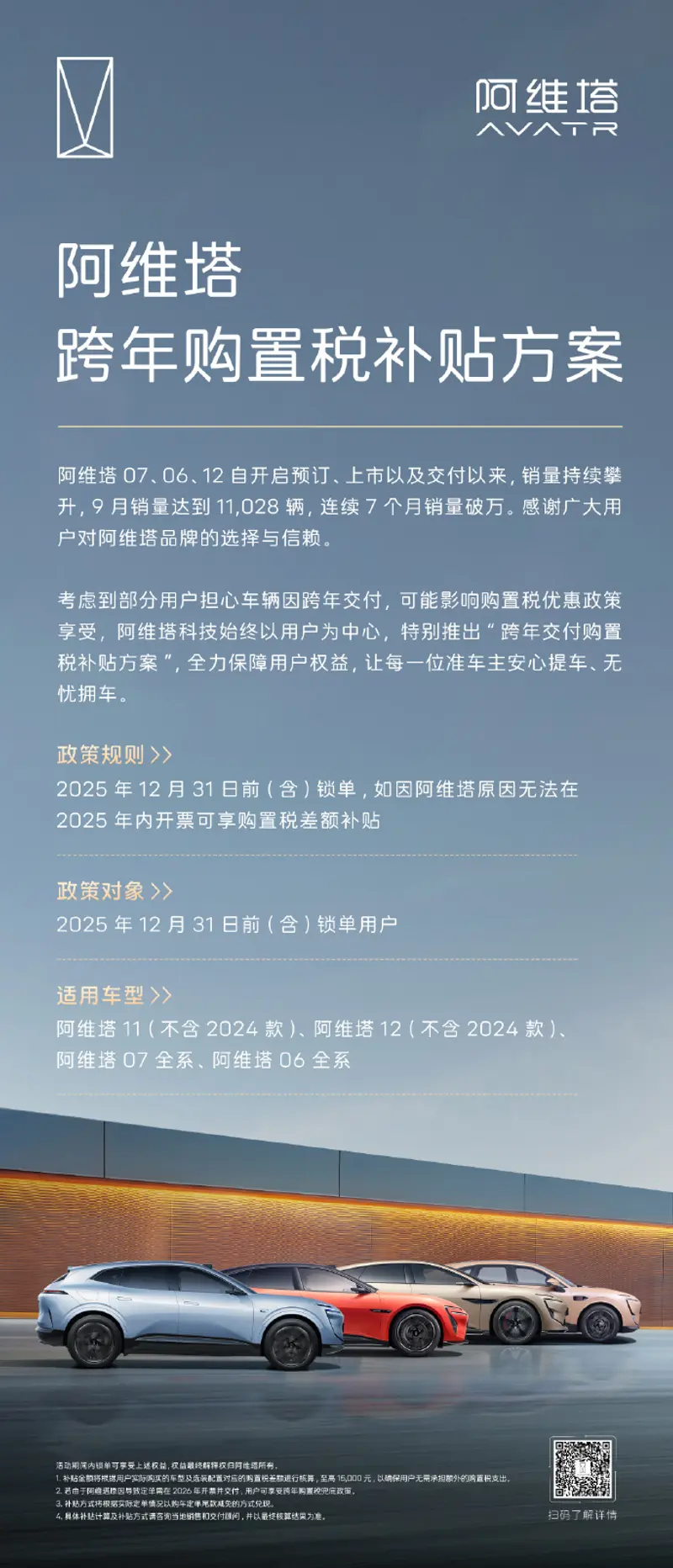 阿维塔07、06、12自开启预订、上市以及交付以来,销量持续攀升,9 月销量达到11,028辆,连续7个月销量破万。政策规则,2025年12月31日前(含)锁单,如因阿维塔原因无法在2025年内开票可享购置税差额补贴。政策对象,2025年12月31日前(含)锁单用户;适用车型,阿维塔11(不含 2024款)、阿维塔 12(不含 2024 款)、阿维塔07全系、阿维塔06全系。