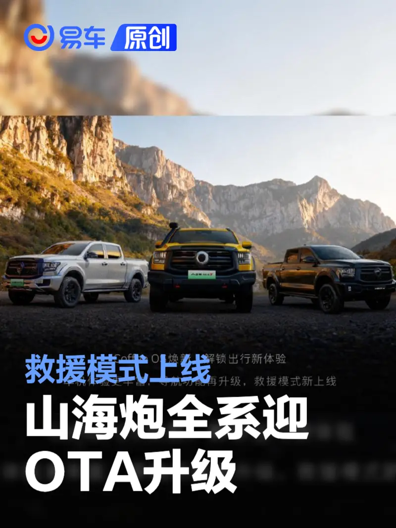 山海炮全系迎OTA升级 救援模式上线 2025-11-10 12:08 来源:汽车产经网 作者:易车原创报道 举报 易车讯 今日,我们从官方获悉,山海炮全系迎来OTA升级。Coffee OS焕新,车机体验更丰富,导航功能再升级,救援模式新上线。具体信息如下: 此次升级,车机应用更丰富,交互界面优化,操作更便捷;高德地图版本焕新,抬头显示功能升级;救援模式上线,牵引能力强化;驾驶体验升级,动力输出更平顺。更多升级内容可在长城皮卡官网查阅。