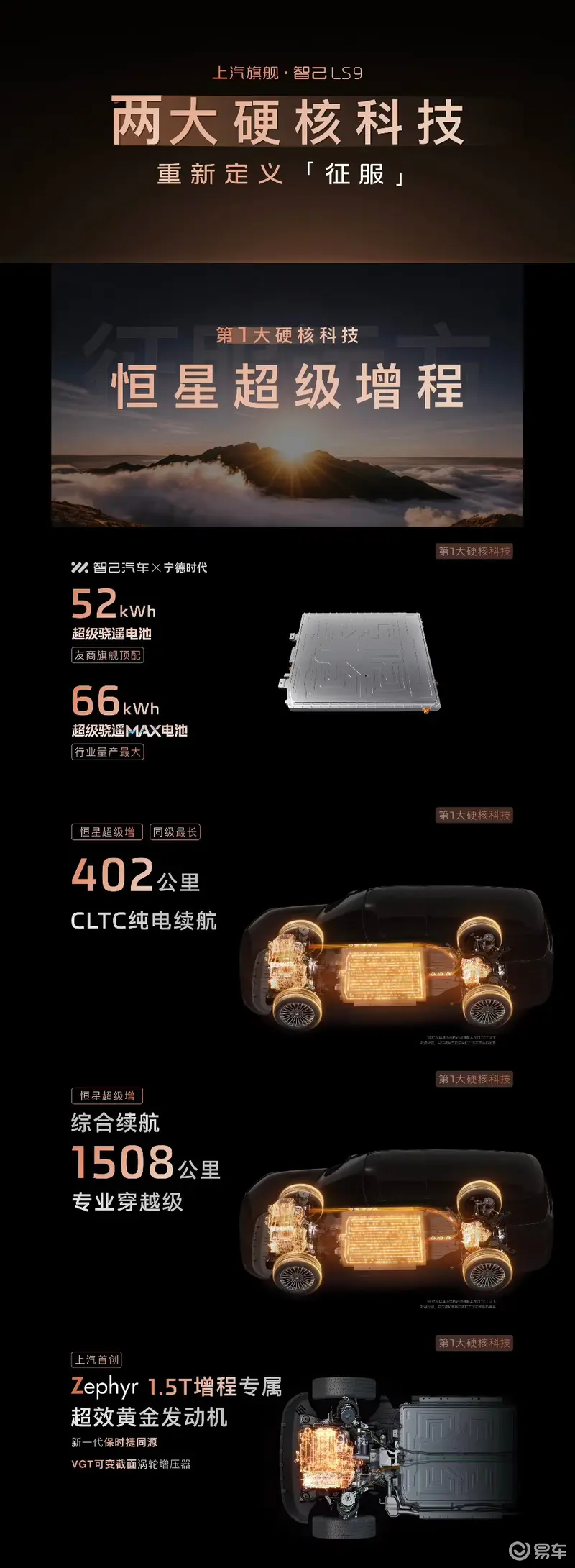 而搭载恒星超级增程的智己LS9具备了同样的优势,它以“66kWh超级骁遥MAX电池+碳化硅飓风电机+800V超快充平台”为技术底座,提供402km的CLTC纯电续航与1508km综合续航。