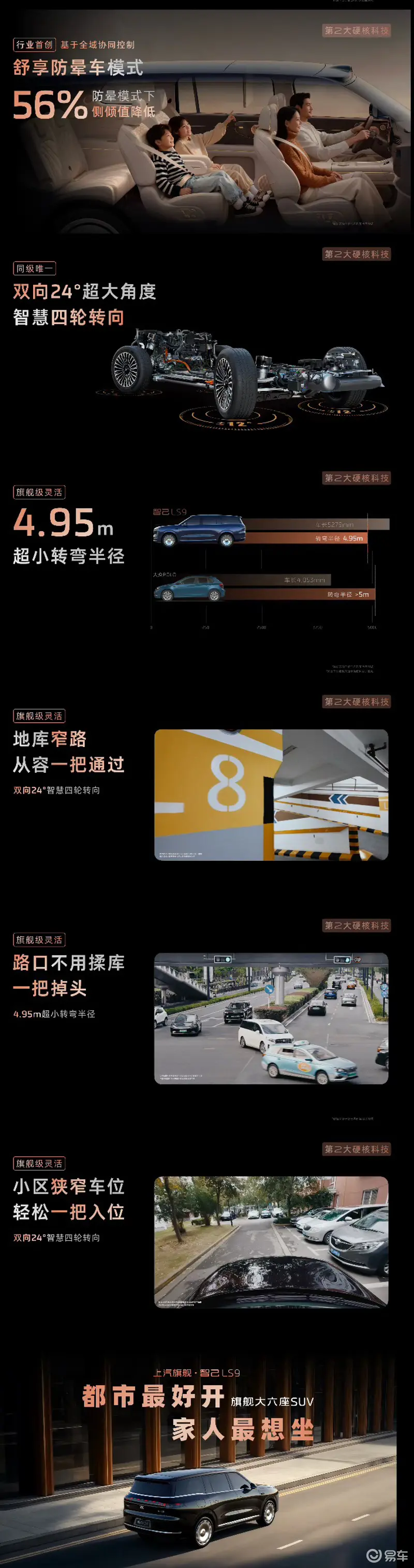 对于一款全尺寸SUV,除了空间大、动力强外,更重要的一点是必须要好开才行,要不然依然无法摆脱“笨重不灵活”、“侧倾像开船”的诟病。智己LS9在这方面显然做的比竞争对手更为用心和出色,让我印象最深刻的就是双向24°超大角度智慧四轮转向系统和仅4.95米的超小转弯半径,再配合智能电控阻尼调节系统,彻底与“大车不敢开”的窘境说再见,让大身板、大空间、高灵活性、高舒适性几个曾经无法兼顾的亮点终于能在一款车上完美结合,这不仅是竞争力的体现,更是一次技术上的里程碑式突破。