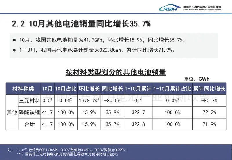 1-10月,我国动力和其他电池累计销量为1233.2GWh,累计同比增长55.1%。其中,动力电池累计销量为910.3GWh,占总销量73.8%,累计同比增长49.9%;其他电池累计销量为322.8GWh,占总销量26.2%,累计同比增长71.9%。