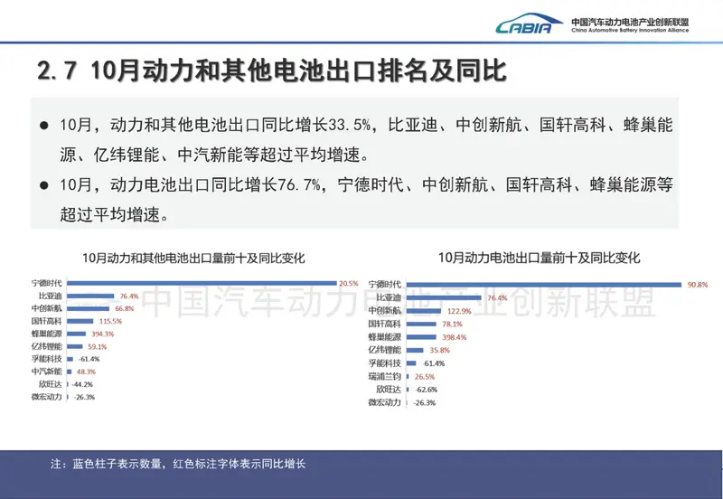 1-10月,我国动力和其他电池累计出口达228.1GWh,累计同比增长43.9%。合计累计出口占前10月累计销量18.5%。其中,动力电池累计出口为148.5GWh,占总出口量65.1%,累计同比增长37.2%;其他电池累计出口量为79.5GWh,占总出口量34.9%,累计同比增长58.3%。