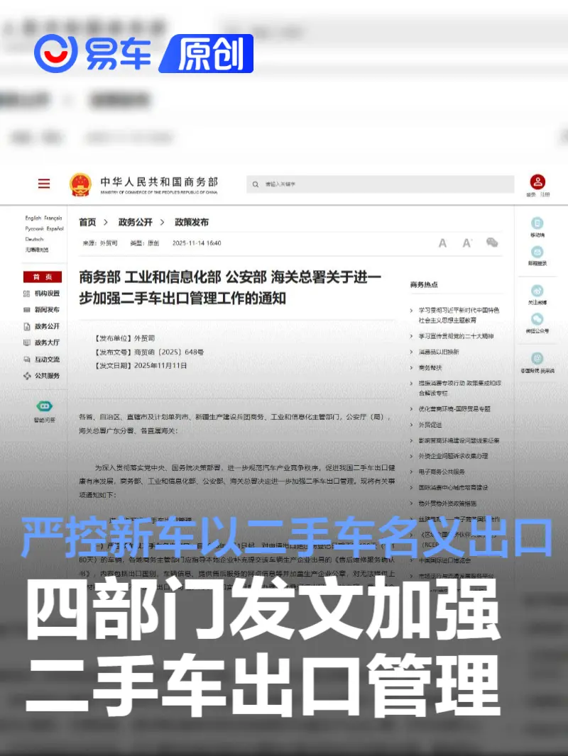 为深入贯彻落实党中央、国务院决策部署,进一步规范汽车产业竞争秩序,促进我国二手车出口健康有序发展,商务部、工业和信息化部、公安部、海关总署决定进一步加强二手车出口管理。现将有关事项通知如下: