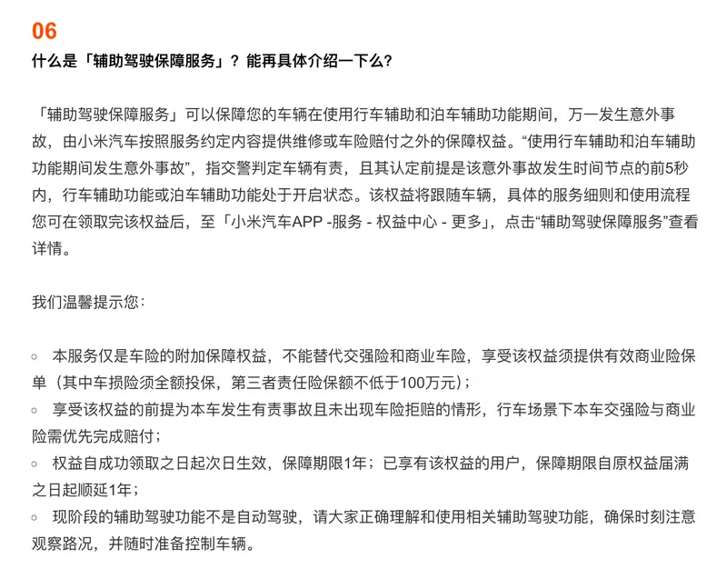同时小米汽车提示,本服务仅是车险的附加保障权益,不能替代交强险和商业车险,享受该权益须提供有效商业险保单(其中车损险须全额投保,第三者责任险保额不低于100万元);享受该权益的前提为本车发生有责事故且未出现车险拒赔的情形,行车场景下本车交强险与商业险需优先完成赔付;权益自成功领取之日起次日生效,保障期限1年;已享有该权益的用户,保障期限自原权益届满之日起顺延1年;现阶段的辅助驾驶功能不是自动驾驶,请大家正确理解和使用相关辅助驾驶功能,确保时刻注意观察路况,并随时准备控制车辆。