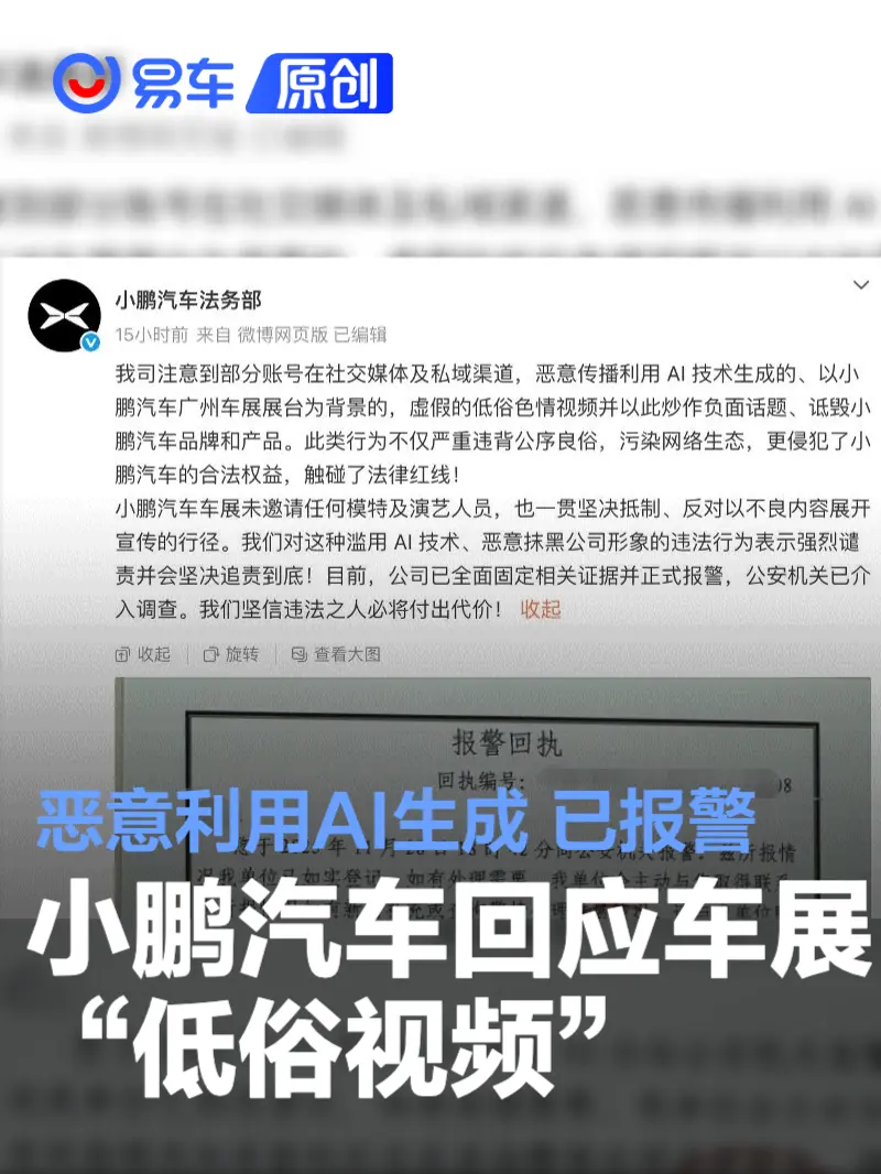 小鹏汽车车展未邀请任何模特及演艺人员,也一贯坚决抵制、反对以不良内容展开宣传的行径。我们对这种滥用 AI 技术、恶意抹黑公司形象的违法行为表示强烈谴责并会坚决追责到底!目前,公司已全面固定相关证据并正式报警,公安机关已介入调查。我们坚信违法之人必将付出代价。
