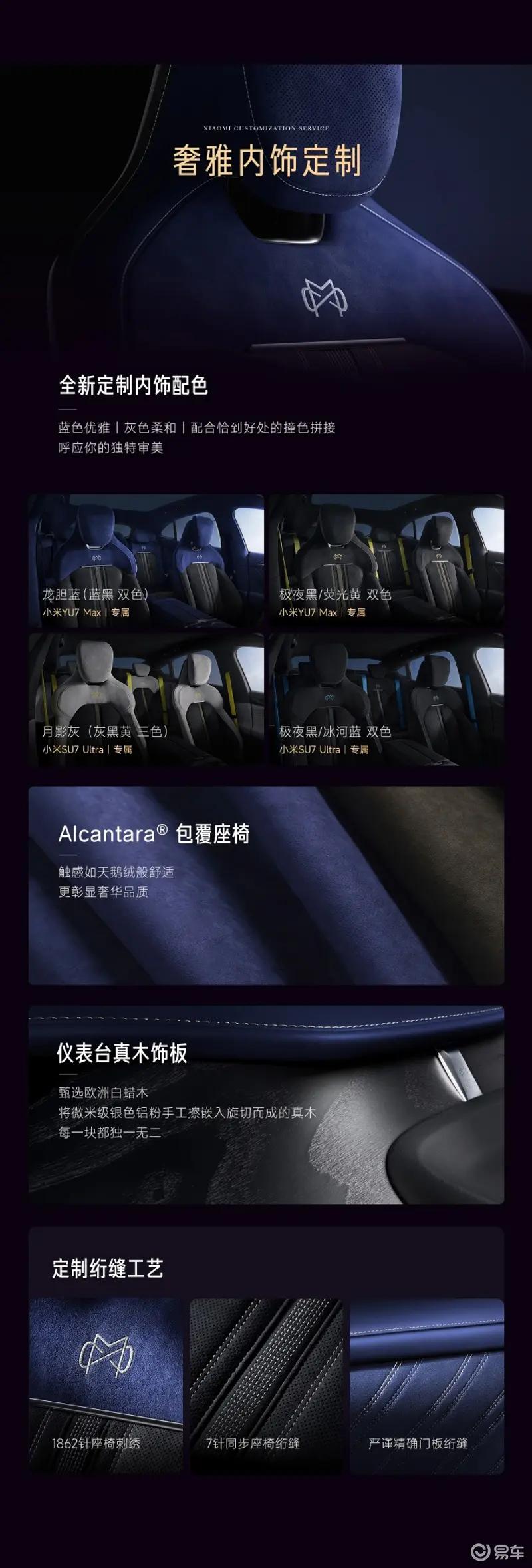 小米汽车推出四款定制内饰,分别为龙胆蓝(蓝黑双色)、极夜黑/荧光黄(双色)、极夜黑/冰河蓝(双色)、月影灰(灰黑黄 三色)。小米定制不仅借鉴奢侈品的色彩搭配,灵活运用蓝色 Alcantara(龙胆蓝)增添时尚豪华;还有山水纹设计的白蜡木真木饰板,其灵感来源 于水墨画中的山水,采用旋切工艺打造出山峰般层峦叠嶂的纹路。不同于其他车企直接真木饰板上车,小米定制在喷漆之后,为了让精心打磨的木材天然纹理更加明显,手工用麂皮蘸取微米级银色铝粉,沿木纹方向反复擦拭,让金属粉填入沟槽,多余部分用静电刷清除。此外,小米汽车还推出定制缝线、定制迎宾灯、定制彩色安全带等服务,采用了专属的刺绣Logo和门板铭牌。