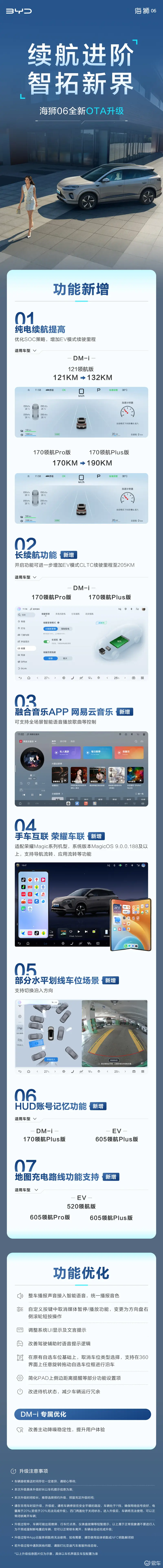 比亚迪海狮06迎全新OTA升级 纯电续航提高 2025-12-10 11:36 来源:汽车产经网 作者:易车原创报道 举报 易车讯 今日,我们从官方获悉,比亚迪海狮06迎全新OTA升级,DM-i纯电续航最高205km。升级内容如下: 值得一提的是,本次OTA升级后,部分车型纯电续航有所提升:DM-i 121领航版由121km提升至132km;170领航Pro版和170领航Plus版续航由170km提升至190km。新增长续航功能,海狮06 DM-i 170领航Pro版和170领航Plus版开启后,可进一步增加EV模式CLTC续驶里程至205km。其他方面,新增网易云音乐、荣耀车联、部分水平划线车位场景等。
