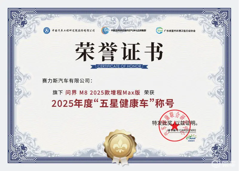 对于注重生活品质的家庭用户而言,选车早不是简单的挑选产品,而是为全家甄选一个安全、舒适、可延伸生活的“第二空间”。问界M8座舱内触手可及的NAPPA真皮、超纤麂皮车顶等,轻松满足家庭用户对品质生活的追求,让全家出游点满豪华感。此外,车辆还采用五星健康座舱标准设计,座舱多处应用健康亲肤材质,并采用UVC+MOFs抗菌滤芯,让全家人安心享受旅程。也因此,在中国汽研最新公布的《C-AHI中国汽车健康指数》中,问界M8荣获“五星健康车”认证。