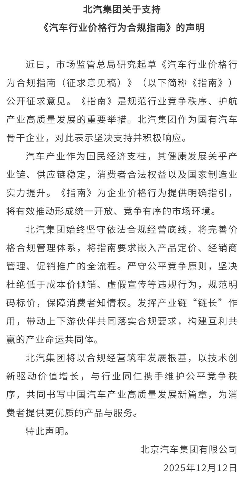 易车讯 12月12日,北汽集团在官方公众号发布了关于支持《汽车行业价格行为合规指南》的声明。北汽集团表示,近日,市场监管总局研究起草《汽车行业价格行为合规指南(征求意见稿)》(以下简称《指南》)公开征求意见。《指南》是规范行业竞争秩序、护航产业高质量发展的重要举措。北汽集团作为国有汽车骨干企业,对此表示坚决支持并积极响应。