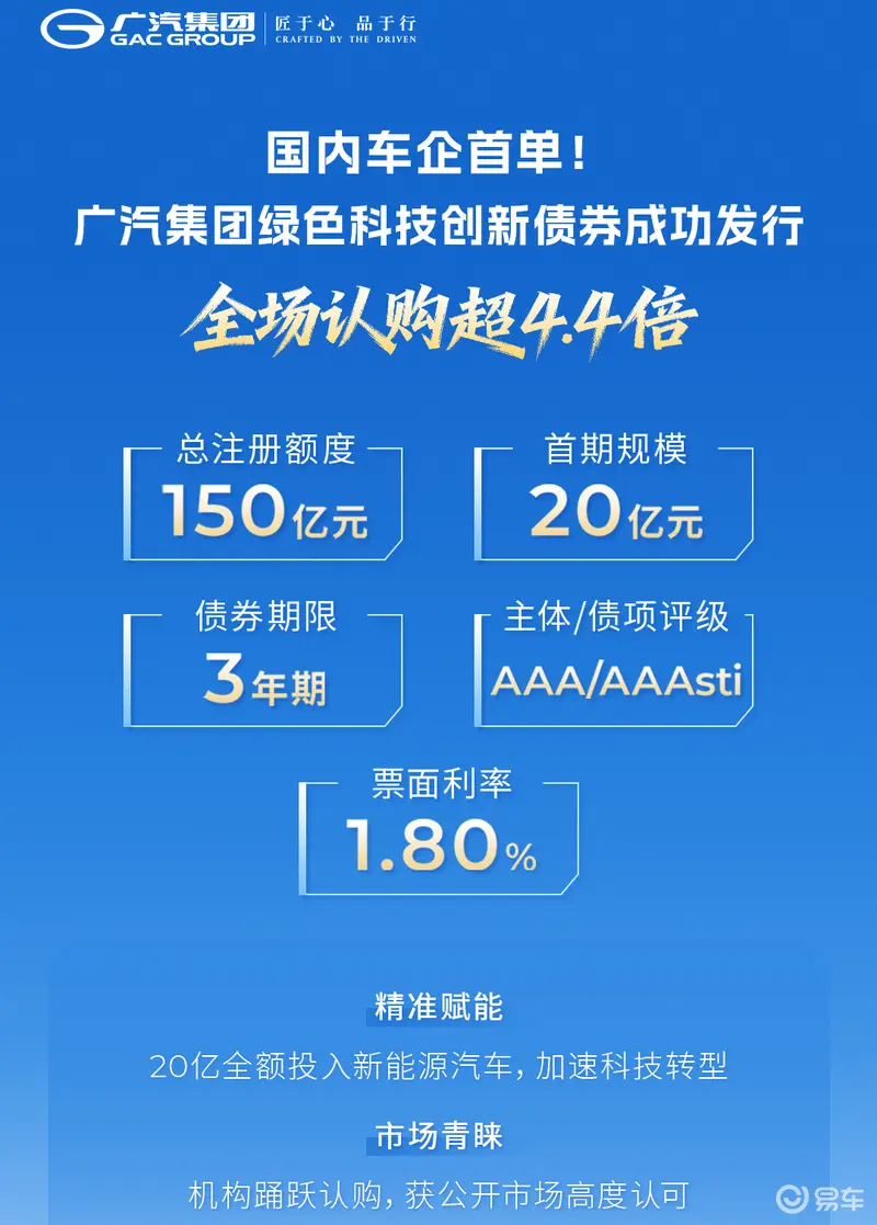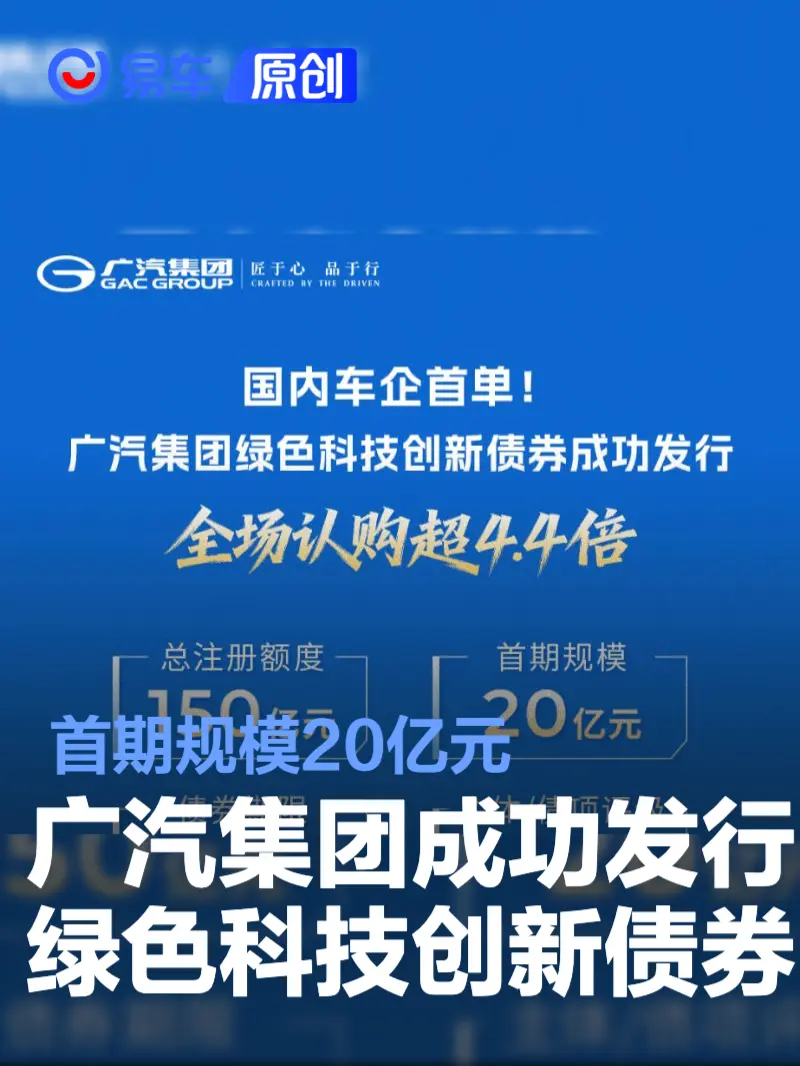 易车讯 日前,广汽集团官方宣布,广汽集团成功发行国内车企首单绿色科技创新债券,本次债券总注册额度150亿元,首期规模20亿元,全场认购超4.4倍。
