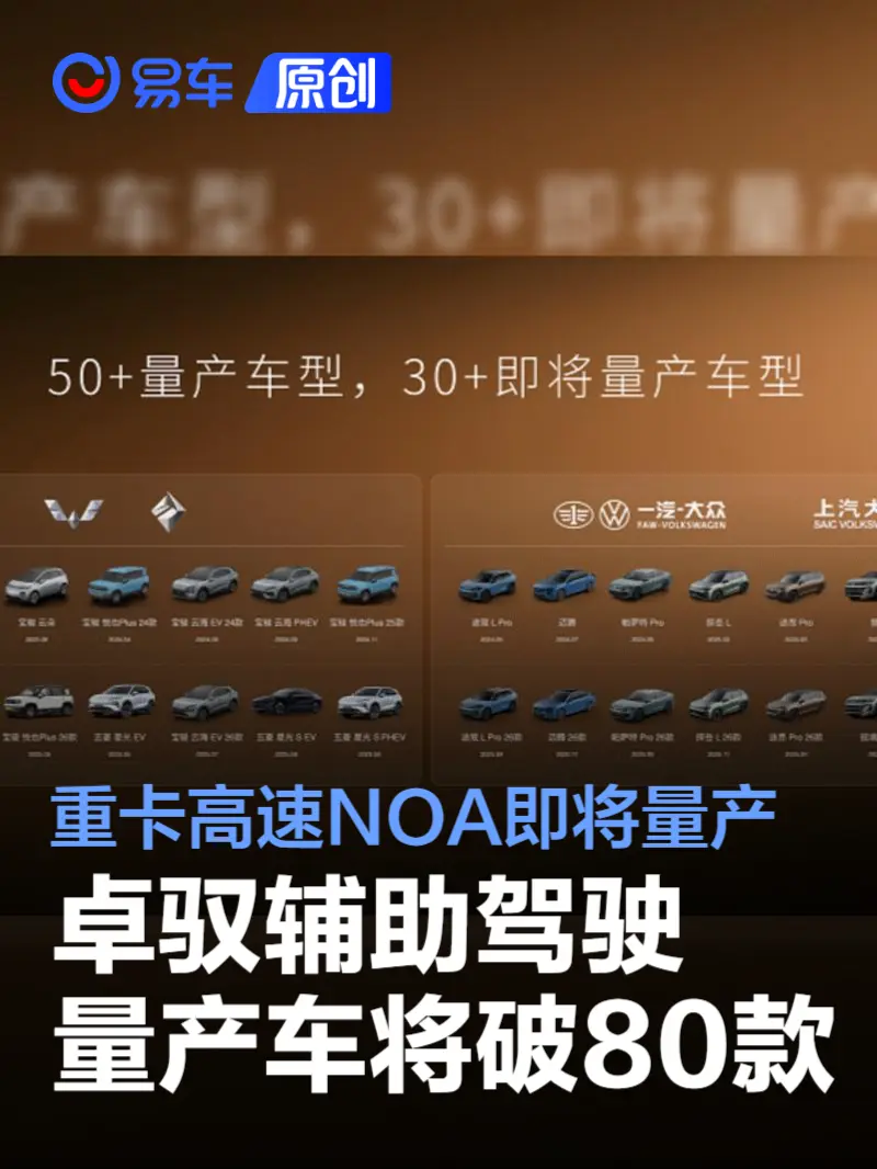 易车讯 12月30日,在卓驭品牌盛典2025活动中,卓驭科技CEO沈劭劼宣布,卓驭辅助驾驶量产车将突破80款,重卡高速NOA将于2026年上半年正式量产,合作客户为徐工、陕汽和重汽。