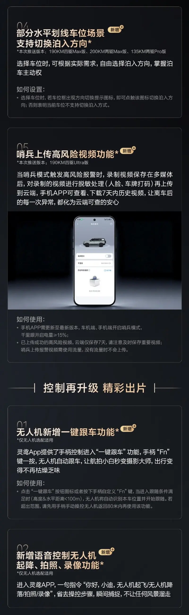 无人机生态全面升级,新增一键跟车功能,在设定范围内,无人机处于飞行中且未处于跟随模式时,点击“一键跟车”按钮,可实现无人机自动跟随本车,航拍小白也能秒变摄影大师,让出行变得不再枯燥乏味。更能通过语音控制无人机操作,一句“你好小迪”控制起降、拍照、录像,全程解放双手,让户外创作更加安全便捷,专注驾驶与创作,不让任何风景溜走。
