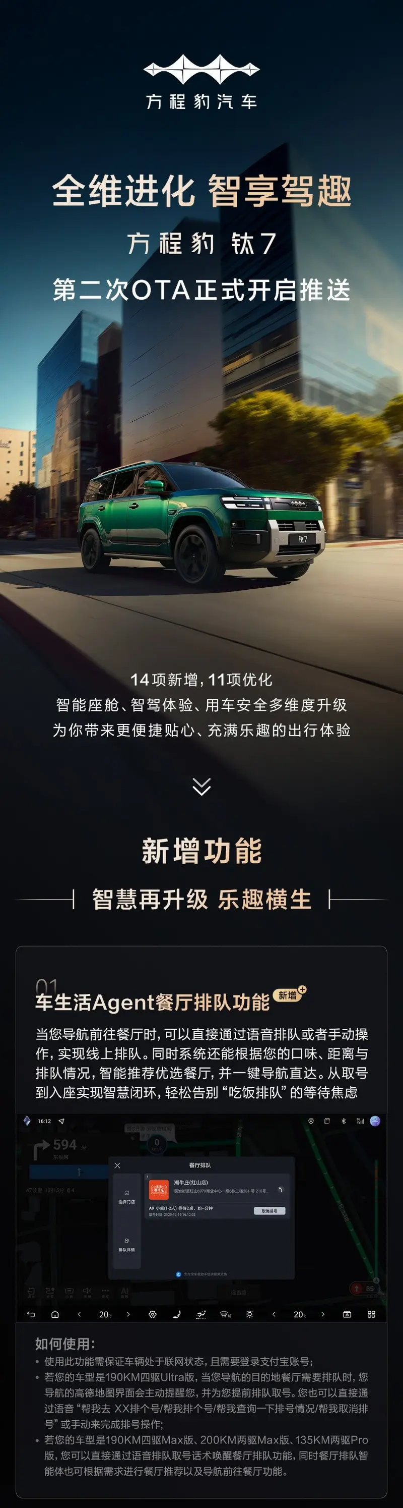 钛7本次OTA升级覆盖智能生活、便捷出行、户外探索三大场景,不断巩固其“大五座天花板”的产品地位。作为方程豹品牌的明星车型,钛7不仅推动了“方盒子车型”从小众走向主流,更凭借优秀的产品力证明了其在细分市场中的统治力,上市以来连续创下销量纪录。未来,通过不断的OTA升级和生态完善,钛7将继续为用户带来更加智能、便捷和个性化的出行体验。