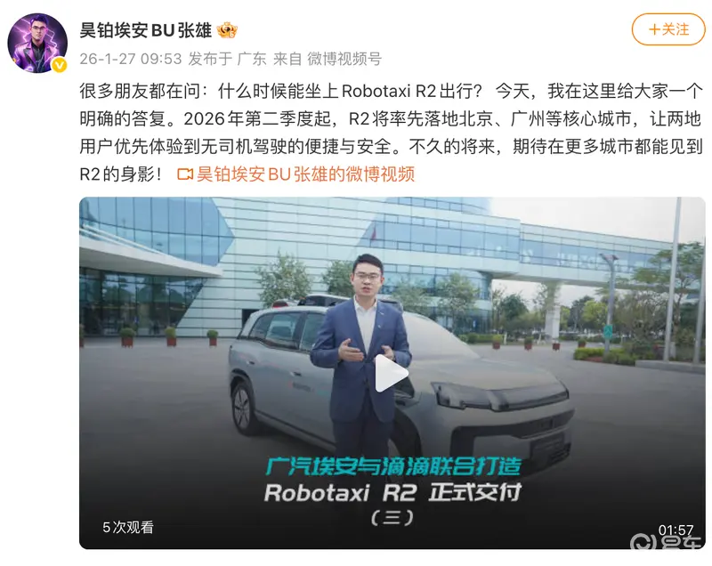 易车讯 今日,昊铂埃安BU总裁张雄发文称,2026年第二季度起,Robotaxi R2将率先落地北京、广州等核心城市。据悉,该车由广汽埃安与滴滴自动驾驶联手打造,新车已于1月23日量产交付。
