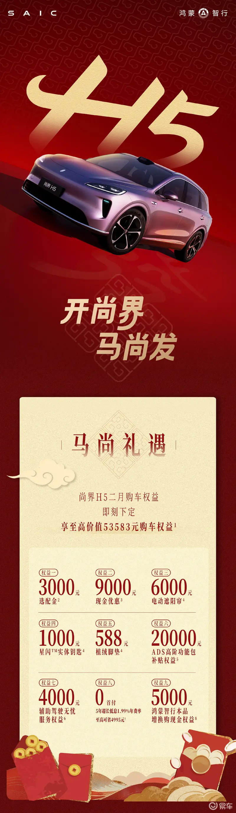 尚界H5推出二月购车政策 享至高价值53583元权益 2026-02-03 14:05 来源:汽车产经网 作者:易车原创报道 举报 易车讯 2月3日,尚界H5推出二月购车权益,即刻下定享至高价值53583元购车权益。权益包含九项内容,包含价值20000元的ADS高阶功能包补贴权益、9000元现金优惠、3000元选配金、价值6000元的电动遮阳帘等。 尚界H5于2025年9月上市,共推出6款车型,售价15.98-19.98万元。2026年1月26日,鸿蒙智行宣布尚界H5累计交付突破30000台,迎来全新里程碑时刻。