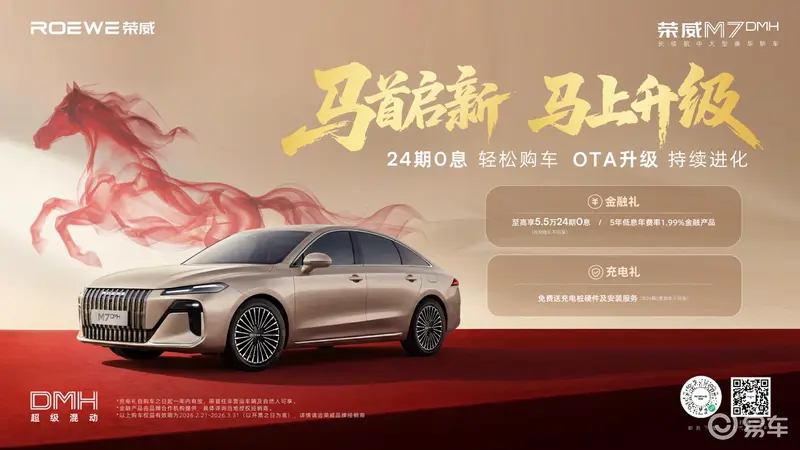 值此新春佳节,荣威诚意奉上价值4000元的新春限时权益二选一活动:即日起至3月31日,选购荣威M7 DMH,即可在“至高享5.5万元24期0息”与“免费送充电桩硬件及安装服务”两项权益中任选其一。